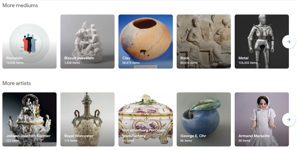 More articles can be found at this Google website. I quickly went into the search area and typed “ceramics” which returned 4 collections and 24 stories. Scrolling down the results page I see additional areas to dive into, including 56,473 items under “Clay”.