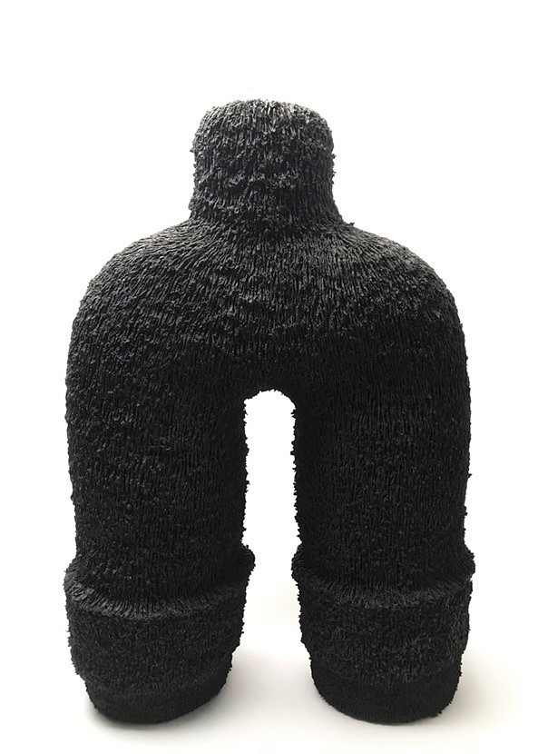 DH: My current ceramic body of work is a mid-range brown clay stoneware that when fired in oxidation will fire to a charcoal black at cone 1. However, I fire my work to cone five. The clay body consists of a black mason stain and is not glazed. So the work has a matte finish in appearance. I work with this clay because I want the clay medium itself to be content to discuss what it means to be a black man and person of color in places, spaces, and times when being a black person may or may not be welcoming or hospitable. These ceramic objects are vessels, each making symbolic allusions to the black body.