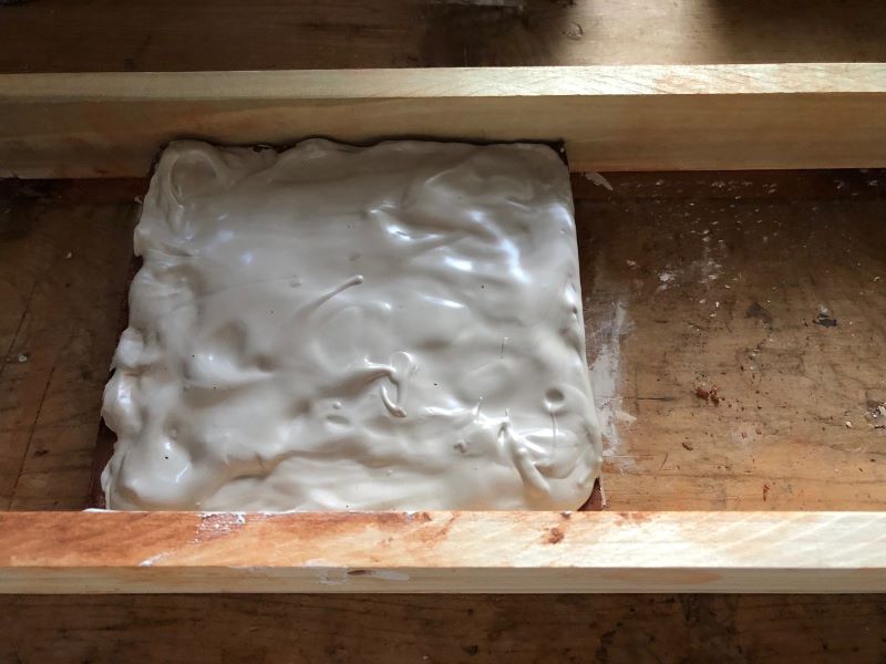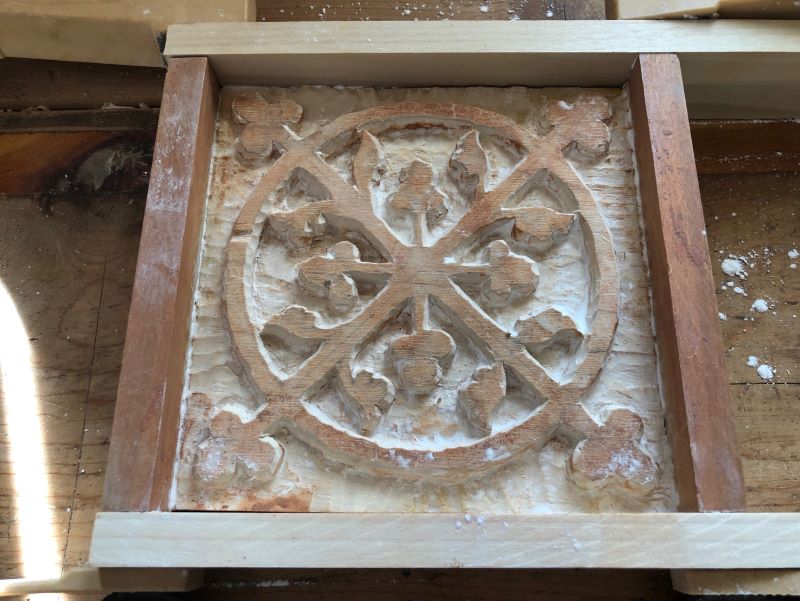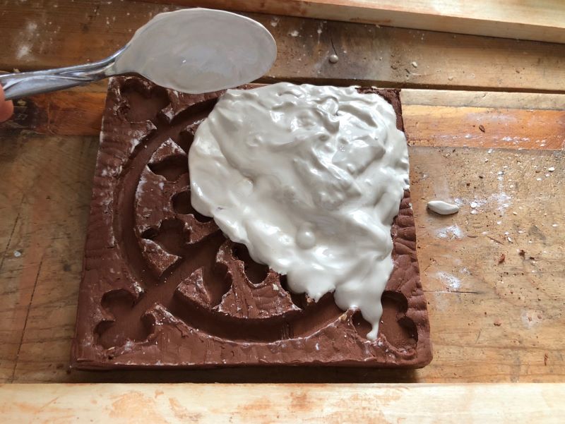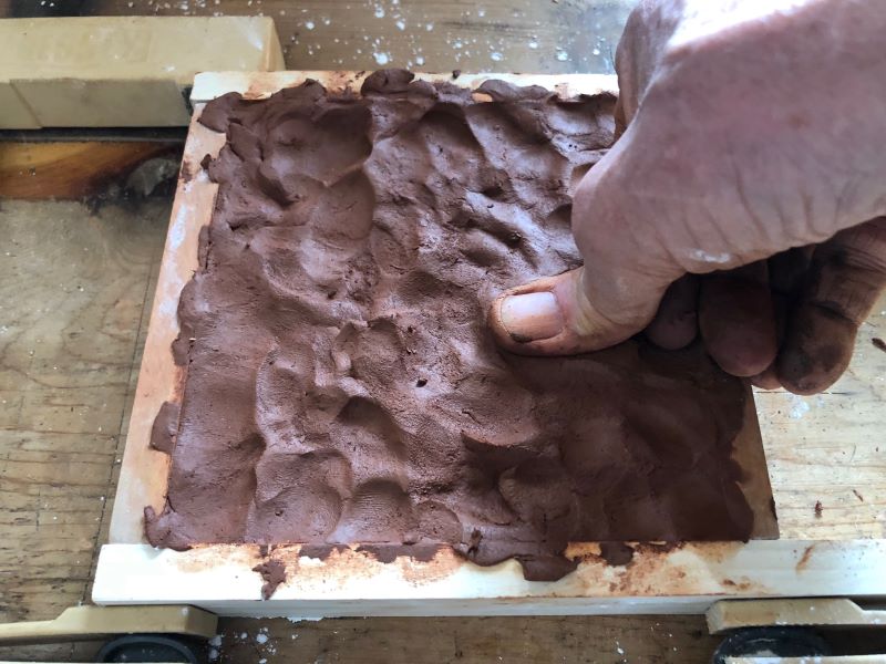 I tried my hand at making 2-color tiles. It was a lot of work to carve out the wood mold. I initially undercut the wood mold, so clay did not easily slide off the mold. After a few modifications I got it to work – helped along by some baby powder sprinkled on the wood surface prior to pressing clay into the mold. Once I constructed a mold, I was able to punch out several tiles each day. I pressed red clay into the mold for the ground, scrapped excess clay off the back of the tile (while still in the mold), and then popped the leather-hard tile out of the mold. I then slopped some white clay slip into the recessed areas of the red clay to produce the white inlay effect. Hopefully you can make out my process in the photo sequence below.