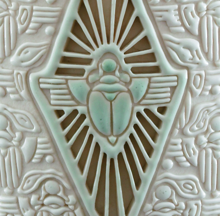 Garth first pointed me to Scarab Vase, created in 1910 by Adelaide Alsop Robineau. It is a centerpiece of the Everson collection (one Everson director referred to this porcelain vase as the “Mona Lisa of the ceramics world”). Adelaide Robineau burst on to the international ceramics scene by exhibiting the work, and winning the Grand Prize, at the Turin International Exposition in 1911.
