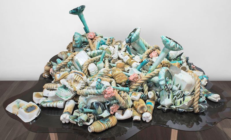 I use color as a tool to shape ideas, trying to arrive at the essence of form. The rendering of various glazes to create the perception of foliage now has changed. Now I am interested in using color as a way to unify forms without being specific about the organic-ness of plants. You will see this in my most recent installation, Bounded Fragility, a floor piece based on the idea of a carpet, covering earth, all one glaze. It hasn’t been revealed yet, but soon.