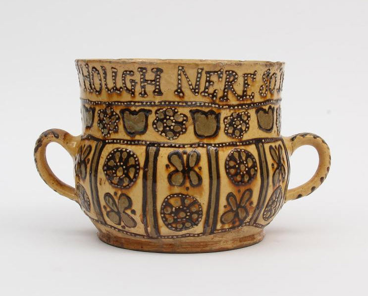 The Gardiner Museum has a small online collection of English slipware. Two delightful examples are shown below – the first a cup with the script “THOUGH NERE SO DEEP – YOU’L IN ME PEEP” encircling the rim, the second a “charger” or decorative plate.