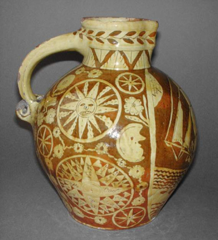 Slip is essentially just clay mixed with water. Potters would apply an even coat of this liquified clay across the vessel to decorate. Early on, English potters would carve away portions of the slip coating to reveal the color of the underlying earthenware clay, a technique known as Sgrafitto.