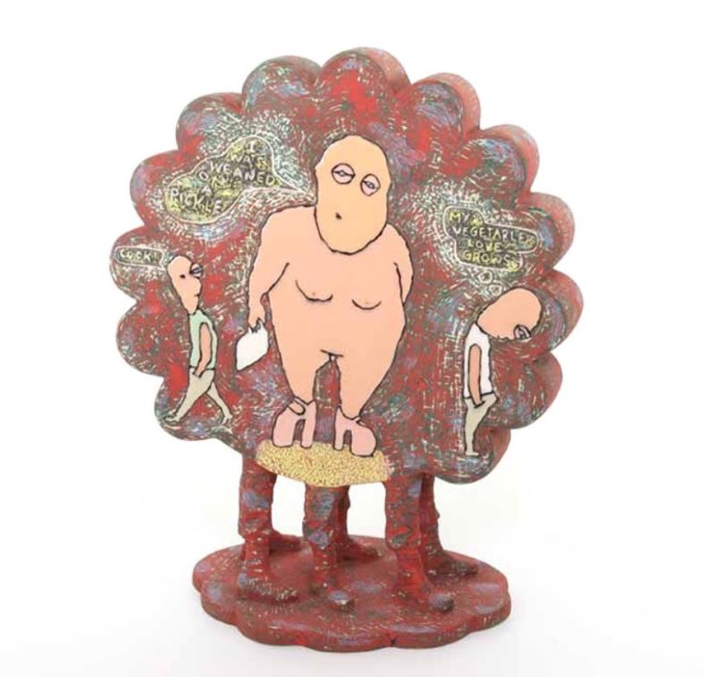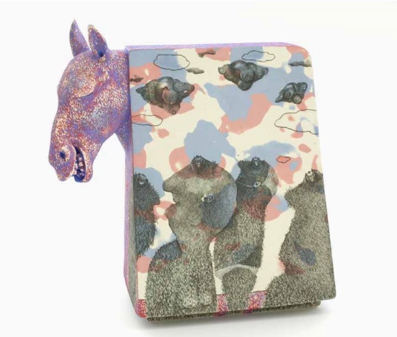 PM: At the moment I’m working with porcelain slabs. I first sketch the form and write about the subject matter and the gist of the story. I roll out the slabs and start building the sketch with clay. The surfaces are layered with drawings, texture, and minimal words. The pieces are memorializing and celebrating people I have known in the past tense. The introduction of slabs is new and it’s supported a different way of working- if I think it, then it can be built quickly. The one restriction to the form is the size of my kiln.
