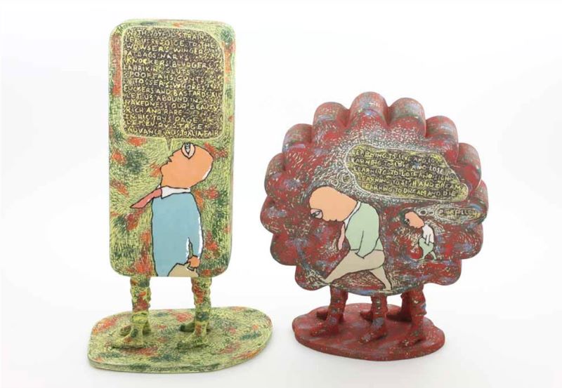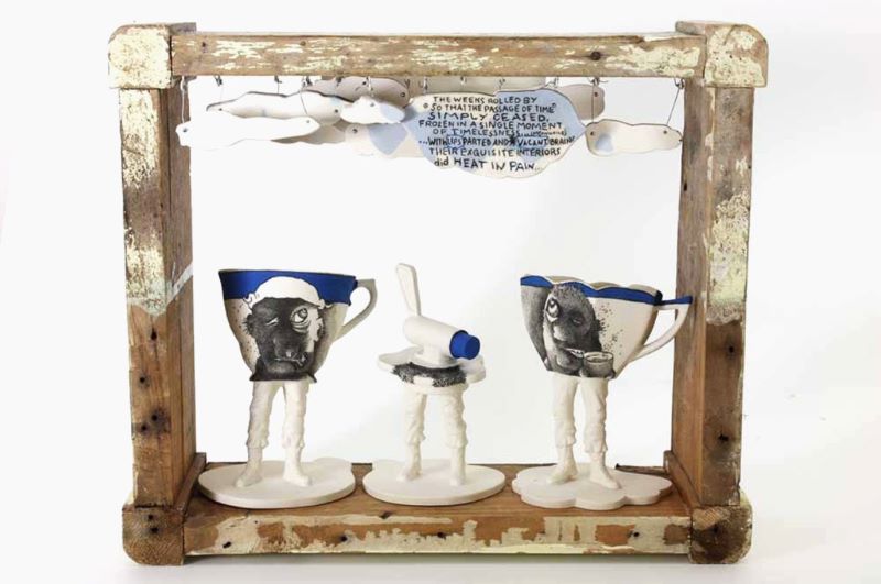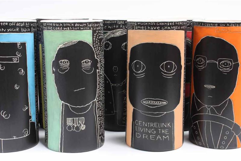 Pru Morrison is an Australian artist building porcelain sculptures, cups and teapots from her home base in Brisbane. Laced across her pieces are bits of text and commentary on everyday life in Australia. Her comments are wide-ranging: art, politics, current events, and observations of life and people around her. More of her work can be found on her website.