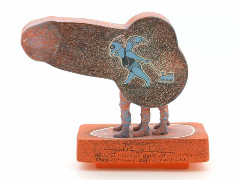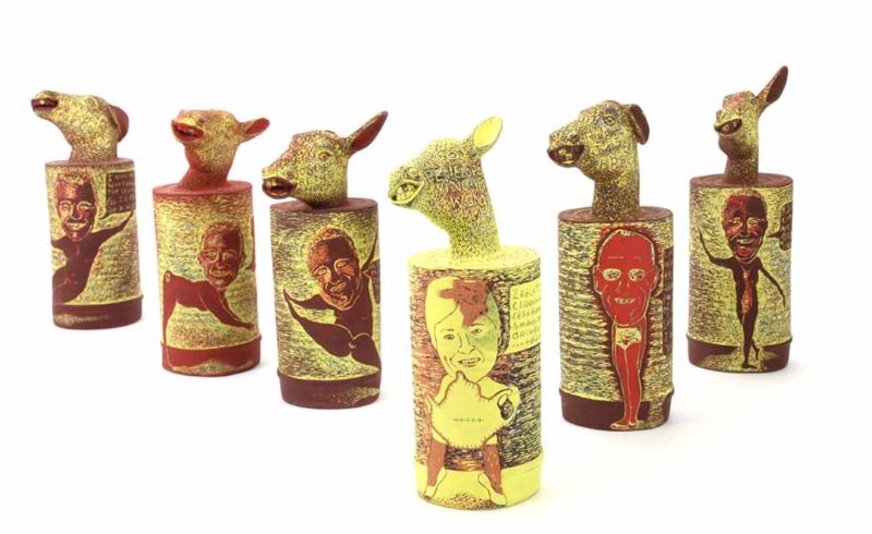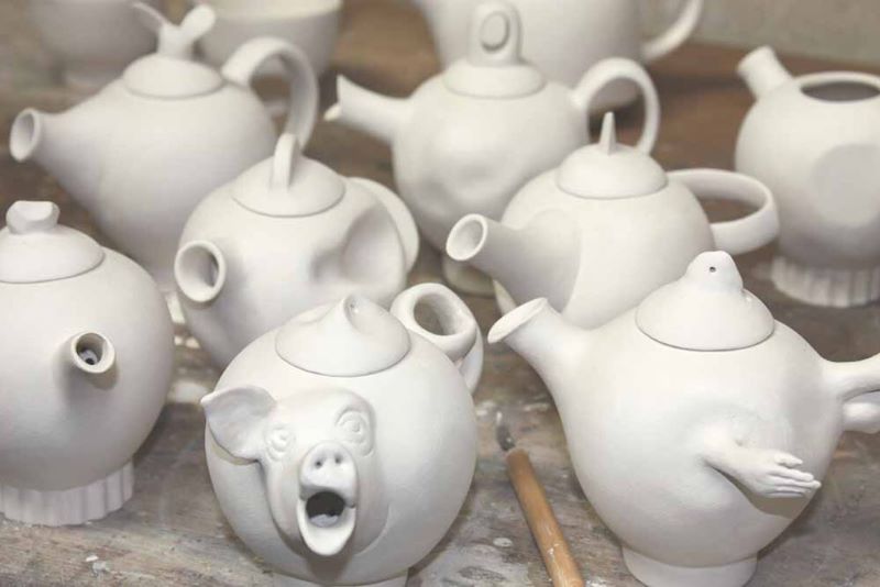 PM: When I first started working with clay I made functional forms and covered them with drawings and text. I later started making molds and slip casting work. I made molds of plastic farm animals, baby-dummies, wing nuts and action figures to name a few. I slip cast them and constructed spouts and legs which I attached to leather hard teapots and cups. This is when the form gained importance and worked alongside the drawings and text. They seemed to come together spontaneously with little forethought.