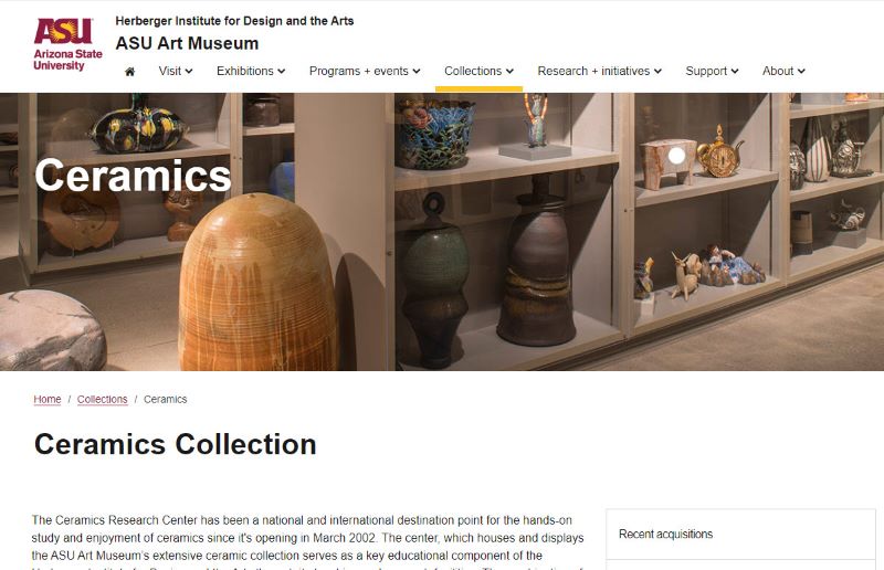 AU: You can view works from a past traveling exhibition, “Innovation and Change,” the most comprehensive selection of works from the ASU Art Museum Ceramics Research Center collection: https://asuartmuseum.asu.edu/collections/ceramics