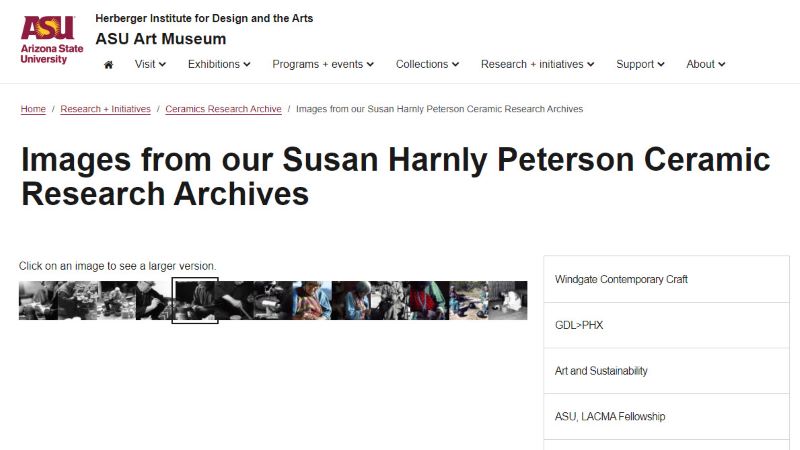 There are also images online from our Susan H. Peterson Archive Collection. Susan Harnly Peterson (1925-2009) was a world-renowned ceramic artist, writer and professor. Her book publications include: Shoji Hamada: A Potter’s Way and Work, the Craft and Art of Clay, and The Living Tradition of Maria Martinez. A selection of these archives from these artists are here: https://asuartmuseum.asu.edu/research-and-initiatives/ceramics-research-archive/images-from-our-susan-harnly-peterson-ceramic-research-archives