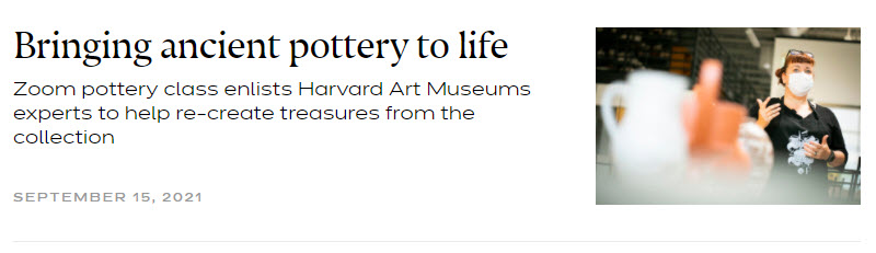 The Ceramics Program at Harvard’s Office for the Arts recently held an 8-week zoom class drawing upon items from the various Harvard Art Museums’ collections. A master potter, Denny McLaughlin, examined and then replicated objects including a pitcher from the 15th century, an Etruscan kantharos, and a Roman beaker. In consultation with conservators from the museums, McLaughlin sought to recreate pieces and in so doing, recreate the processes of earlier ceramic traditions. More on this course is available in a Sept 15, 2021 article in the Harvard Gazette.