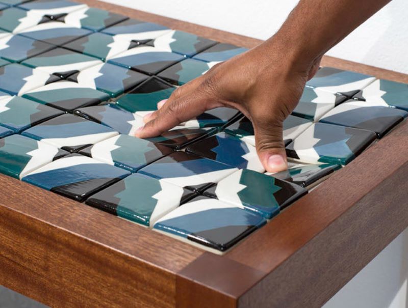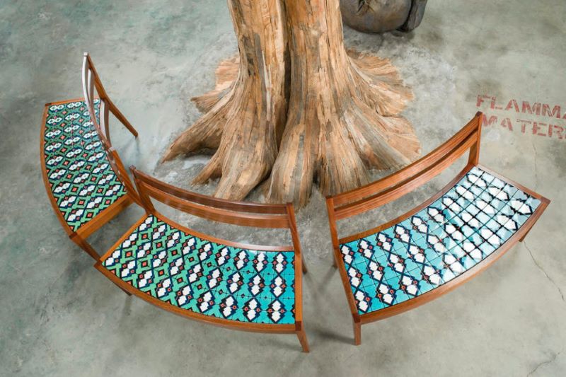 We had just taken a trip to Cuba and spent a lot of time looking at the colorful cement floor tiles in the buildings there. That was a starting point, we knew I would design square tiles with abstract motifs, but I wanted to push the patterns further. So I started to design patterns that changed incrementally across the rows of tile, and color gradients that changed with the patterns. Annie is an amazing woodworker and upholsterer, so she built hardwood frames and made the benches with hidden upholstery foam under the tiled seats, so they are squishy to sit on. It was really fun seeing these come together.