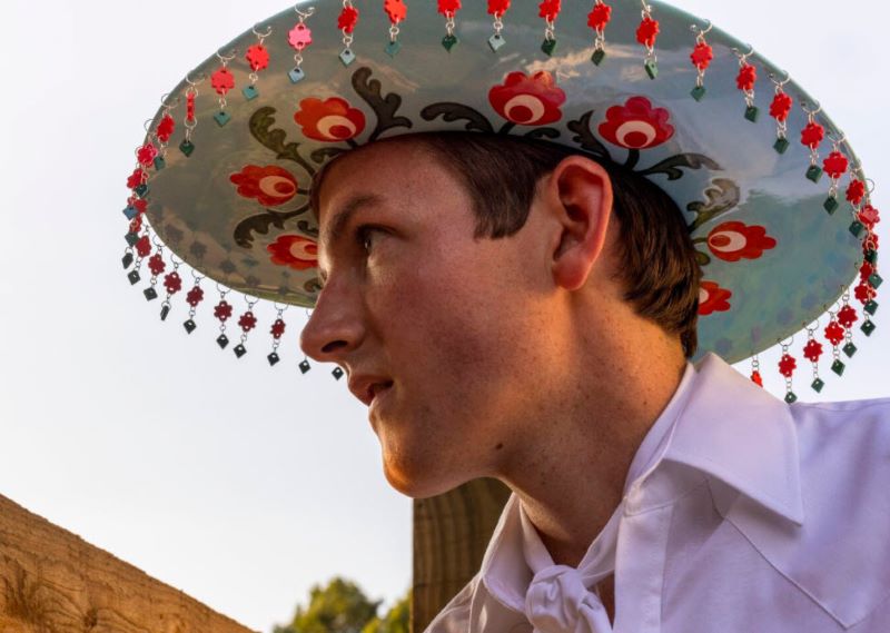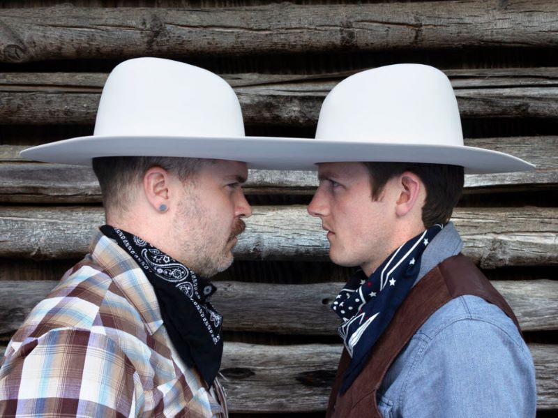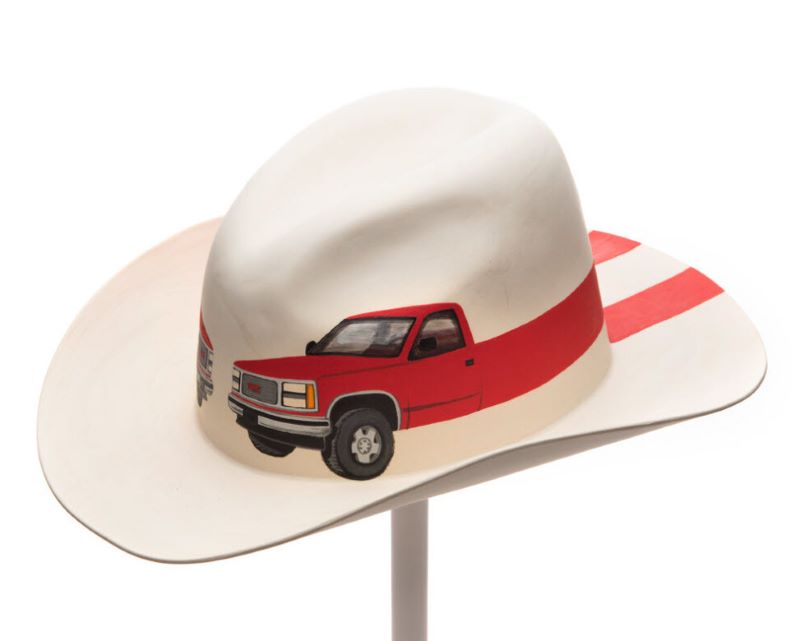 Here’s a culture steeped in machismo, but where a century of iconic figures wore high-heeled boots, tight jeans, bright colors, floral designs, and sometimes even fringe and rhinestones. There’s a fascinating history here, full of diverse influences and wild paradoxes. I took the cowboy hat as a symbol and started making this series called “Fragile Masculinity” where I playfully examine different facets of the manly cowboy ideal. In the double-crowned hat “You Lookin At Me Pardner?” I’m particularly thinking about old Western movies and male barroom posturing, where so much is conveyed by how somebody looks at you. This hat creates a face-to-face confrontation into which both wearers are locked.