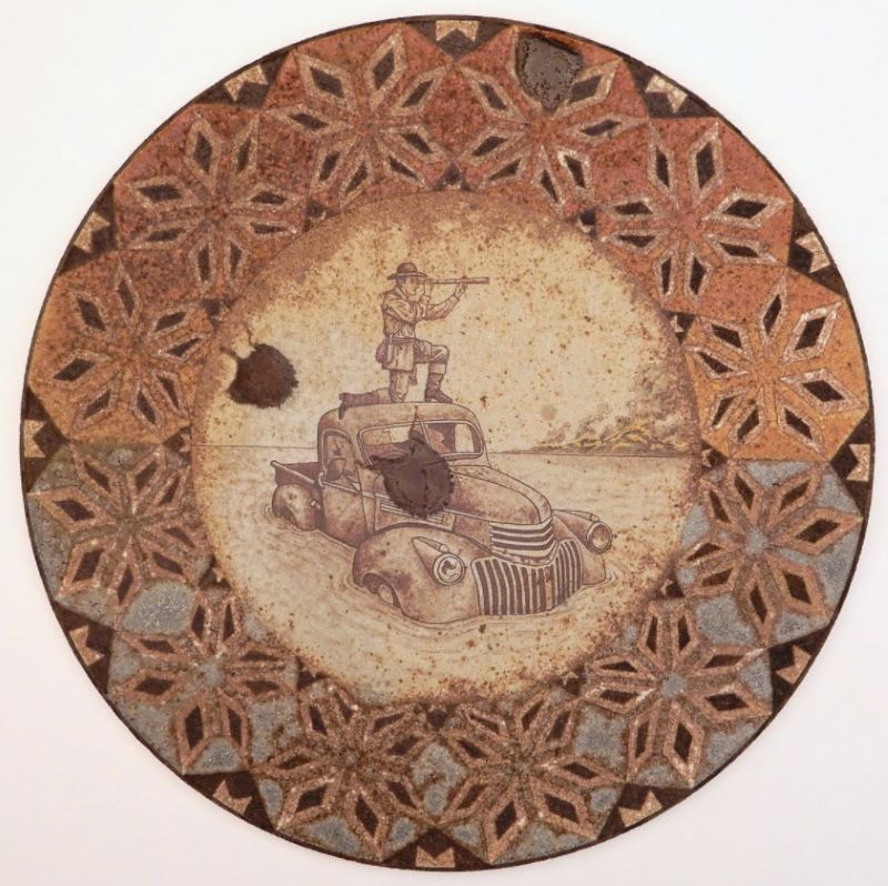 Shae Bishop is a wonderfully creative artist merging disparate art forms (at least in my mind): ceramics and clothing. His stuff is fun, playful, colorful, lighthearted and interesting. As he explained his work, I found some very interesting themes, such as the interplay between the permanence of ceramics and the transience of clothing. Shae also pokes around with what defines masculinity, blurring elements of decoration with iconography of cowboys and the American West.