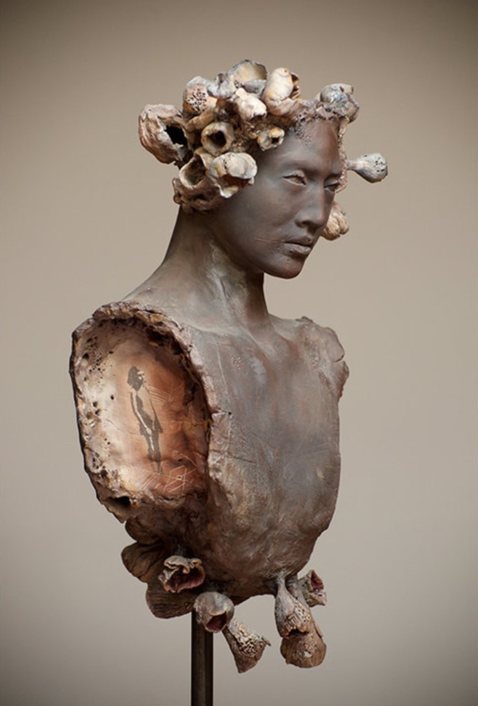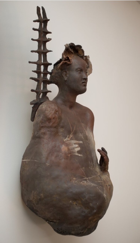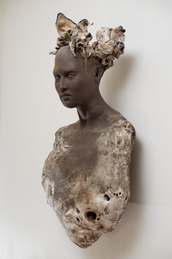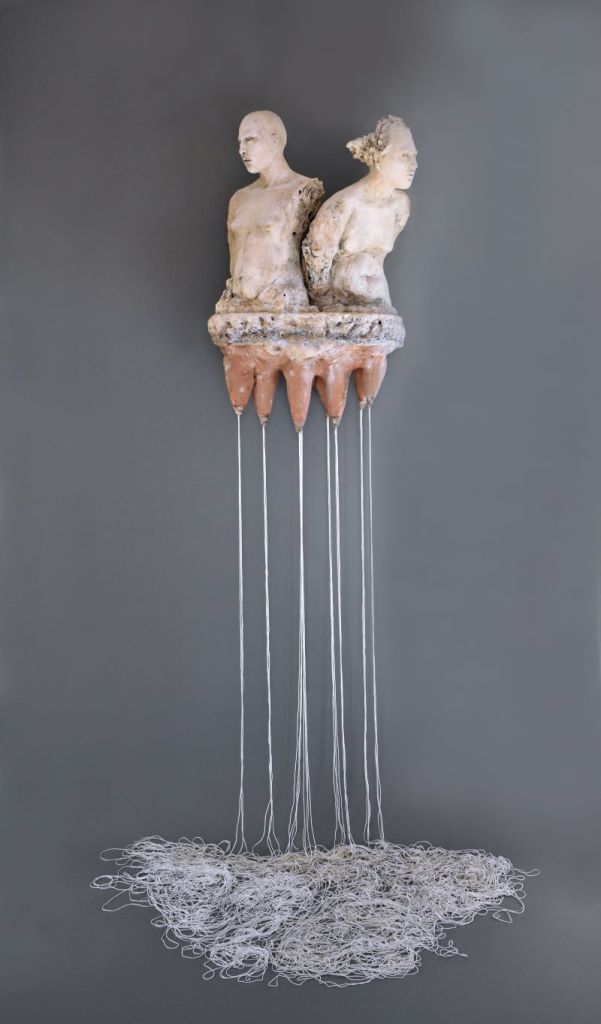 Alejandra Almuelle’s figurative sculpture reveals the human form arising out of organic, elemental, formless shapes of matter, often infused with dark and brooding undertones. There is a consistent suggestion of organic matter, and often a sense of history as well: Andean facial features, classical Greek and Roman materials. Creation. The passage of time. Decay.