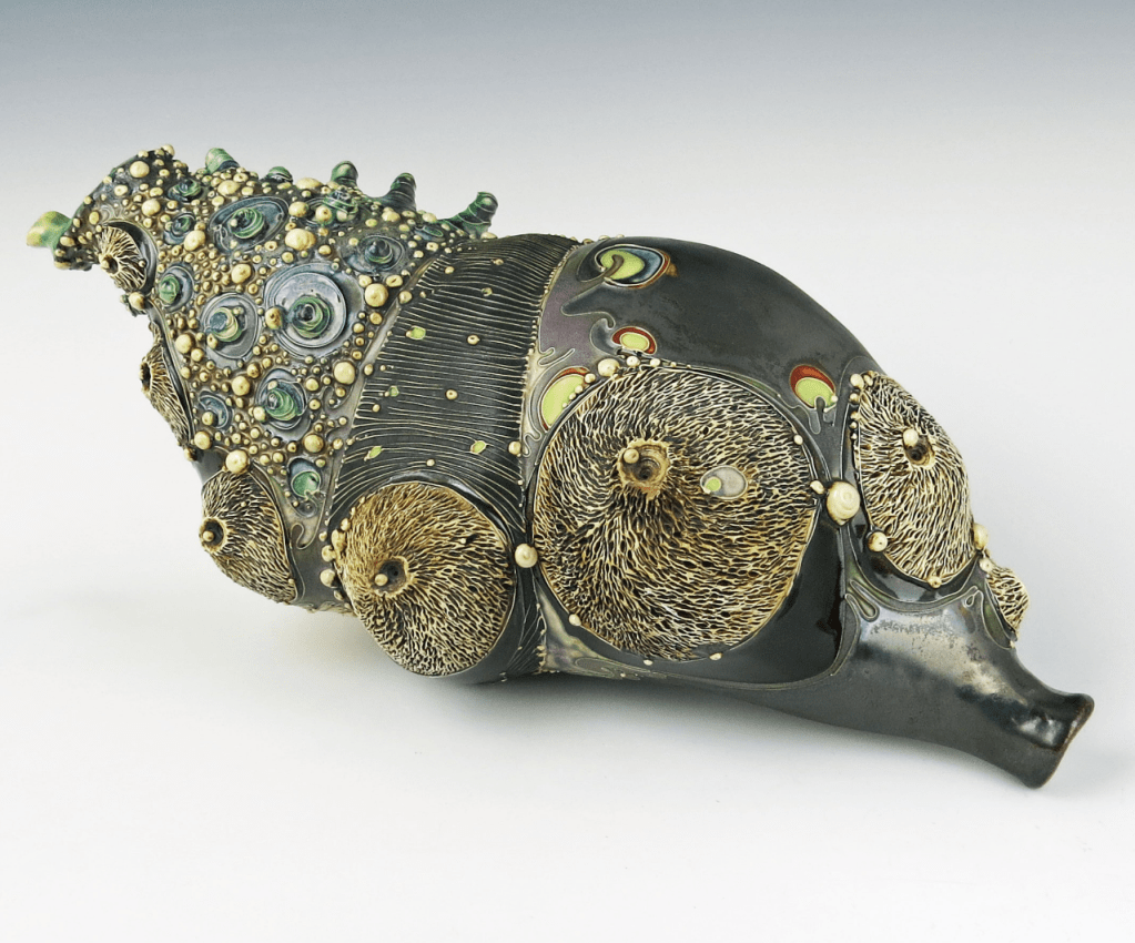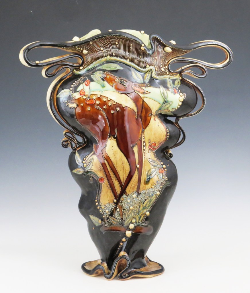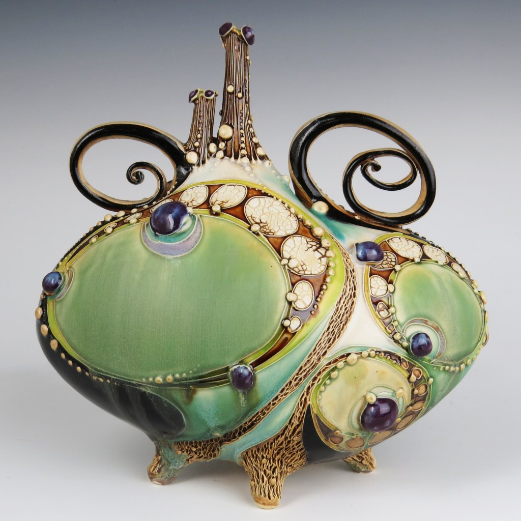 Carol Long is an extremely talented artist working in St. John, Kansas. Her work is lyrical, playful and stunningly well-executed. Carol’s elaborate forms and surface details reflect her childhood experiences growing up around plants and animals on a family farm. Her technical proficiency reflects years as a working potter as well as countless hours she puts into each of her individual pieces.
