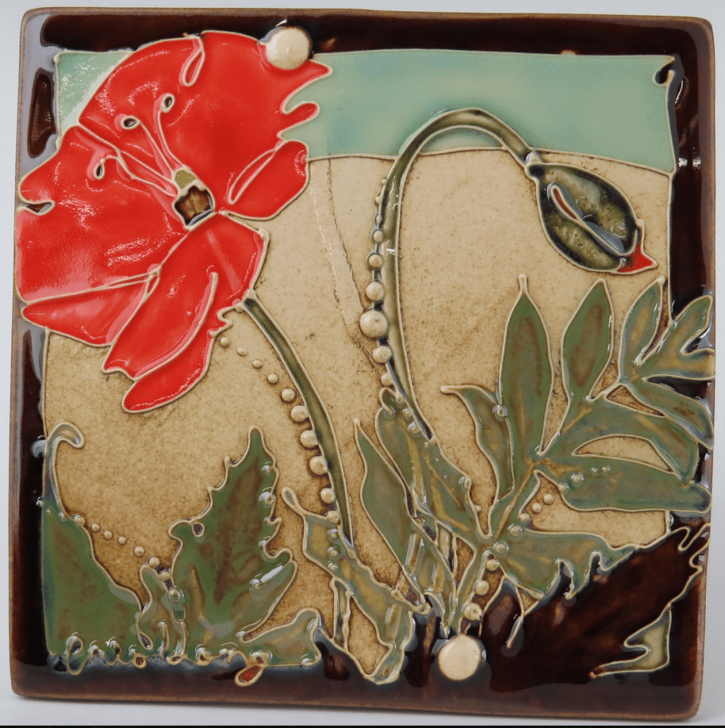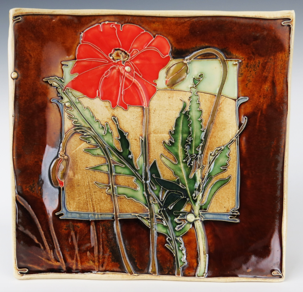 Slip trailing designs have to be simplified on small pieces. They can get messy and crowded leaving little room for the glazes. The slip trailing designs can get very complicated on larger work. Tiles are almost always 6”x 6”. I put several tiles together for larger pieces.