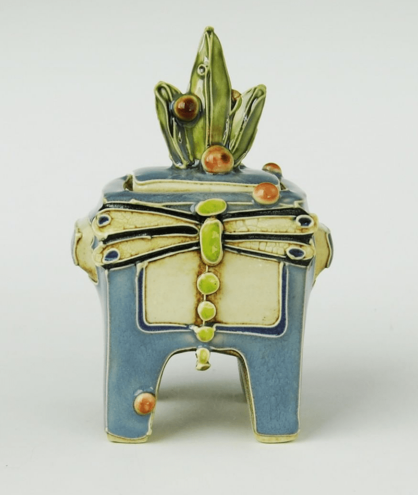 Below is one of Carol’s sculptural vases called “Lidded Butterfly”. Following the first photo is a close up of one section of the piece showcasing Carol’s skills at slip trailing, glazing and overall design. I love the palette, too.