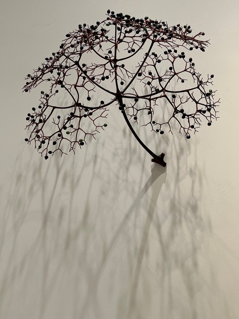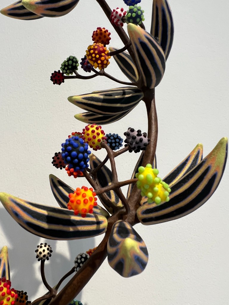 Finally, I particularly liked Michael Sherrill’s ephemeral How Plants Travel made out of porcelain, glass and steel, and Black Medicine, made from bronze, moretti glass and porcelain. Sherrill references the bright colors that plants evolved to attract animals for pollination and dissemination of seeds in How Plants Travel. The works are difficult to photograph but wonderful to appreciate in person.
