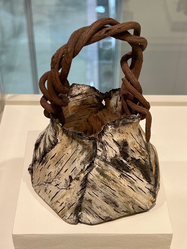 Eric Serritella’s Paperbirch Basket With Vine Handle, 2014, is one item in the collection that illustrates the quality of the overall collection. Serritella’s Basket is a stunning trompe l’oeil gem. The artist creates lifelike illusions of material such as birch wood and vines by skillful application and firing of matte glazes.