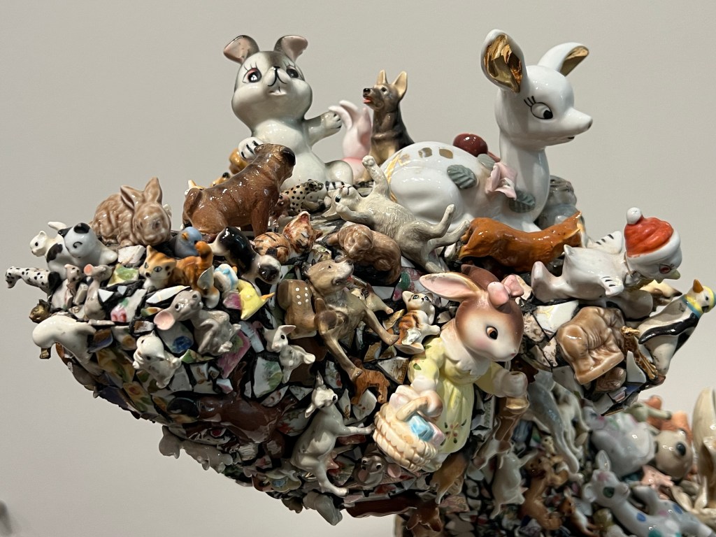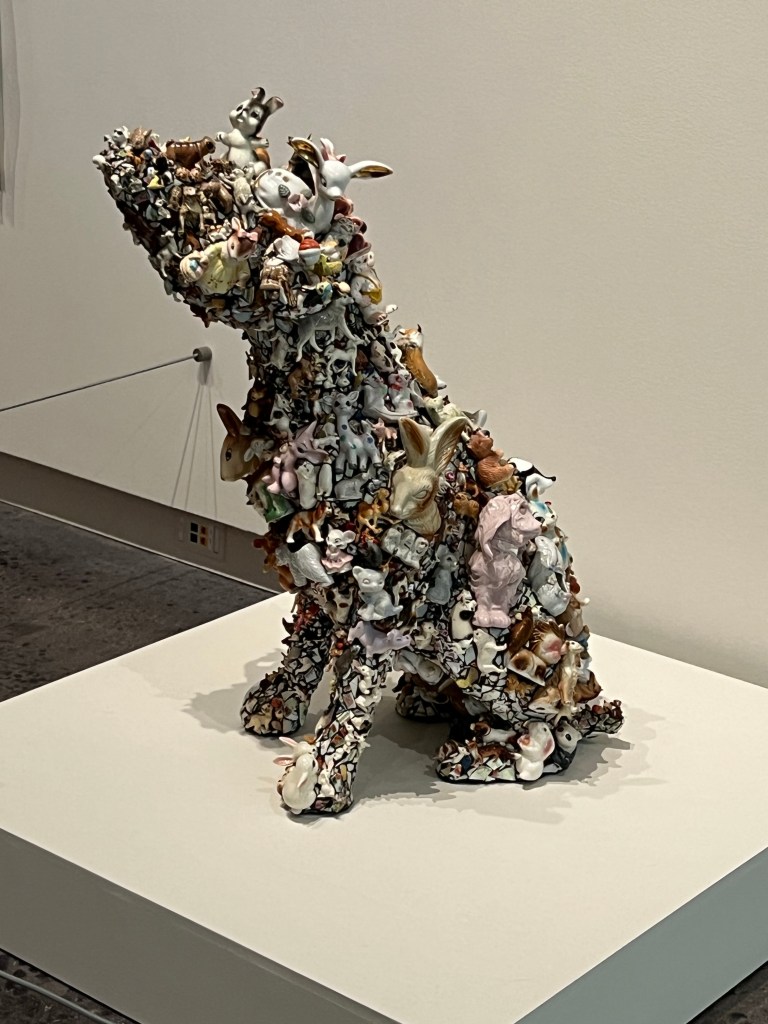I liked how Mary Engel used clay objects as elements in her mixed media sculpture Louise, 2008. Engel is a contemporary artist who explores “ritualized animal imagery symbolizing a bridge between the rational and instinctual worlds” through sculptures of animals, oftentimes family pets, that incorporate family heirlooms and sentimental objects (such as porcelain mementos). Her work is very creative.
