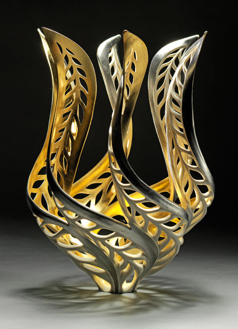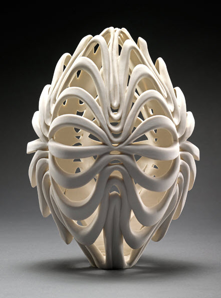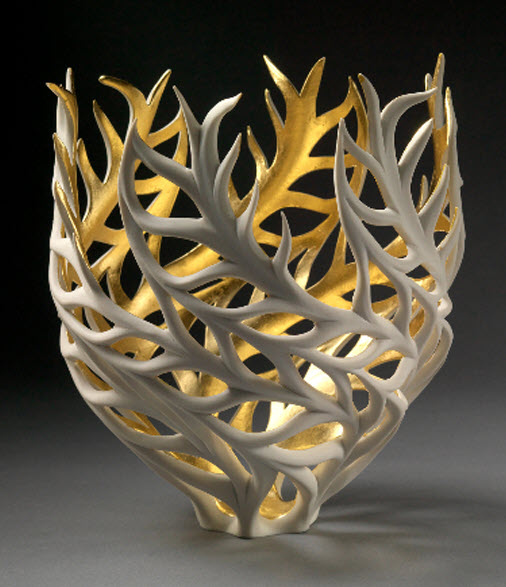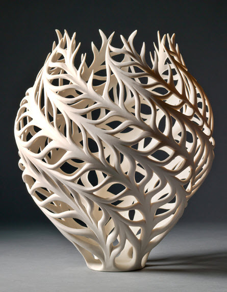 Amy Brummond, who tells me, “I am a slab builder working with red stoneware clay. When I approach a blank slab I consider pattern, texture, and finally color. The first consideration, pattern, is often checked off the list by using one of my favorite newsprint transfer designs from Isla transfers. I use handmade and commercially available stamps to add texture to the base layer pattern, with the intention of adding color to these impressions during the next step of the process.” (Amy’s website)