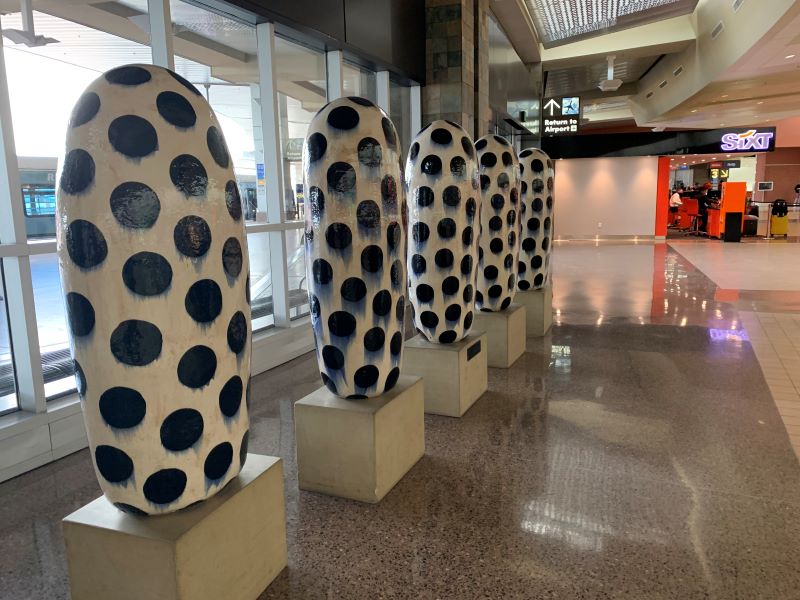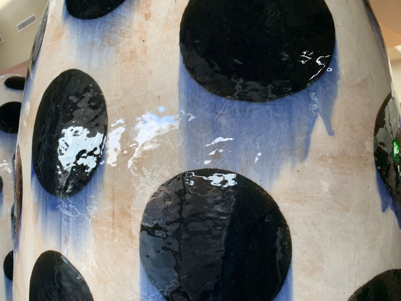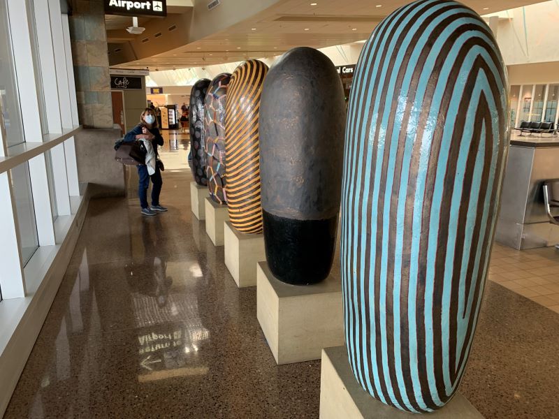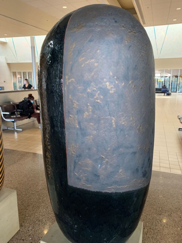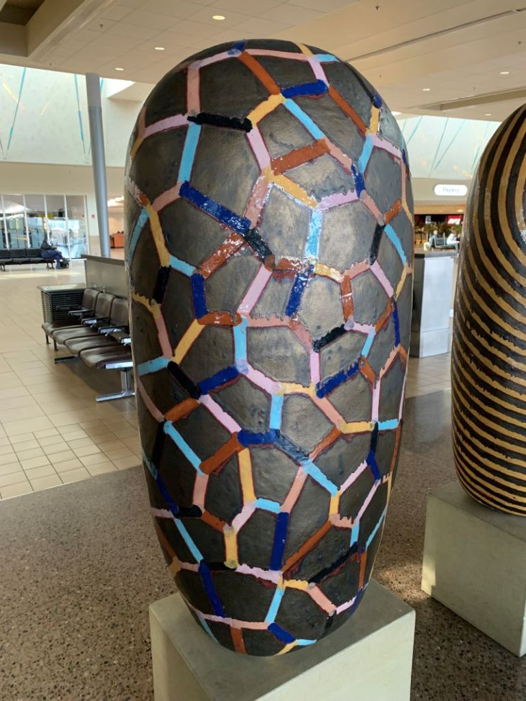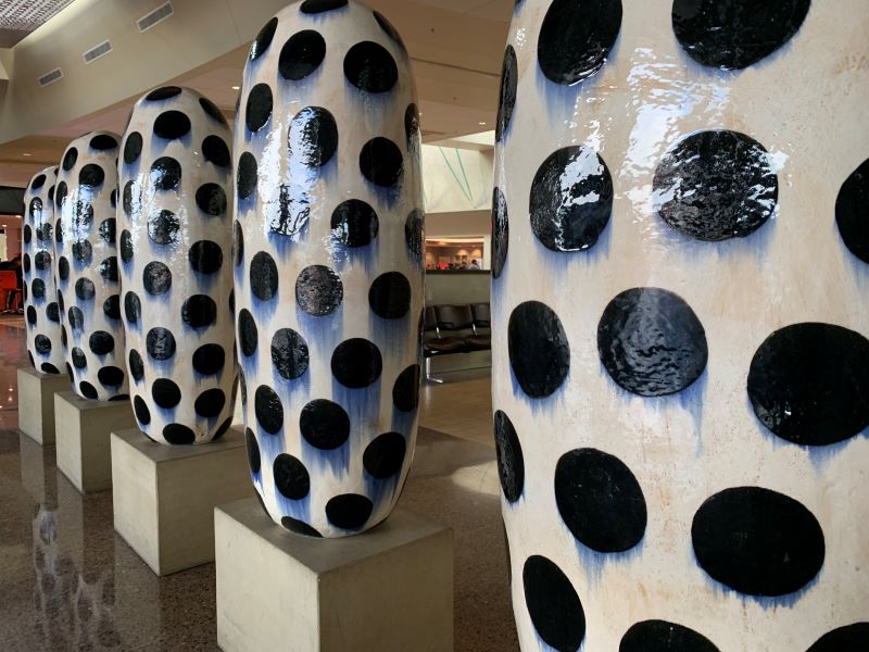 Kudos to the Phoenix Airport for displaying the work of multiple ceramic artists. One group of work stands out for its monumental scale: a collection of large-scale sculptures by Jun Kaneko entitled “Dangos.” They are dated 1991. Here are a selection of images showing these objects.