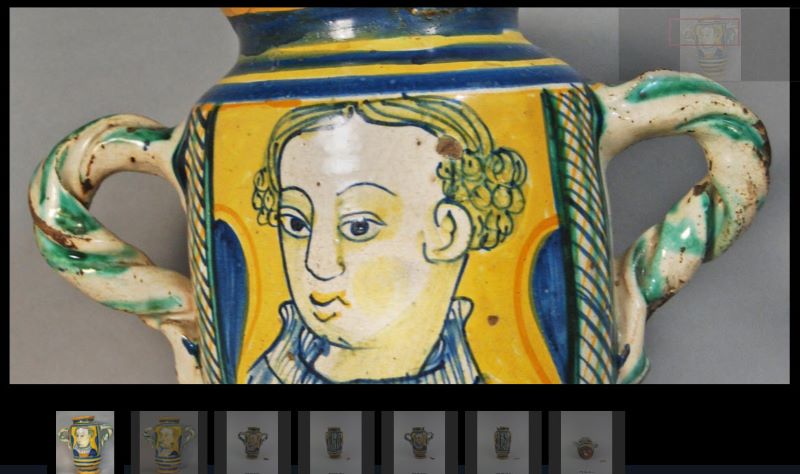 Clicking on the photo in the individual page gives you access to high quality photographs of the object (typically from multiple sides) that allows a viewer to drill into detailed areas.