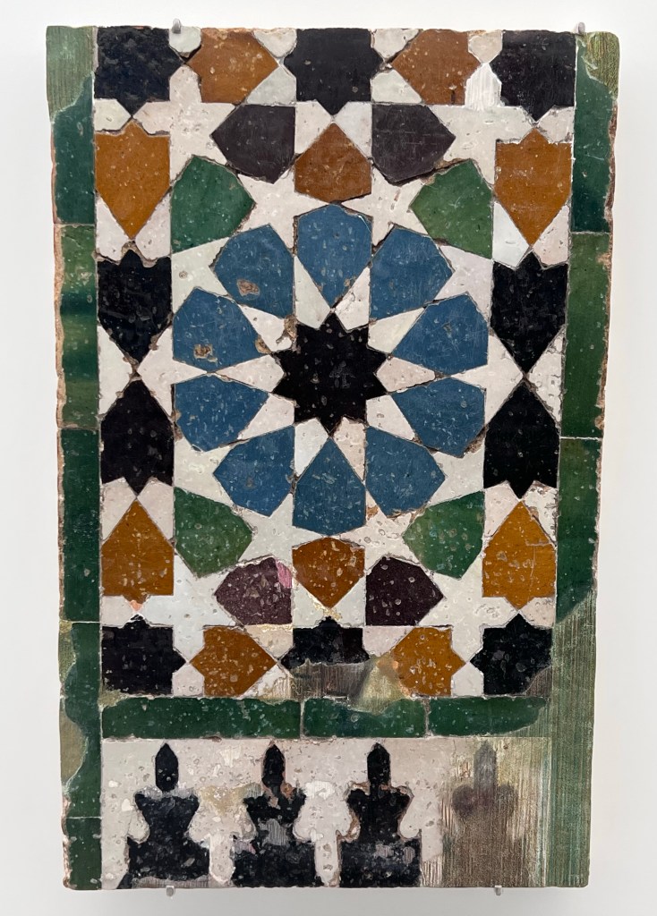 I won’t attempt a fully researched post here as I’m on the road, digesting as much as I can after a full day walking around the Alhambra in Granada, Spain. I will just attach a few images of the ceramic tile work that I’ve seen. Just gorgeous.