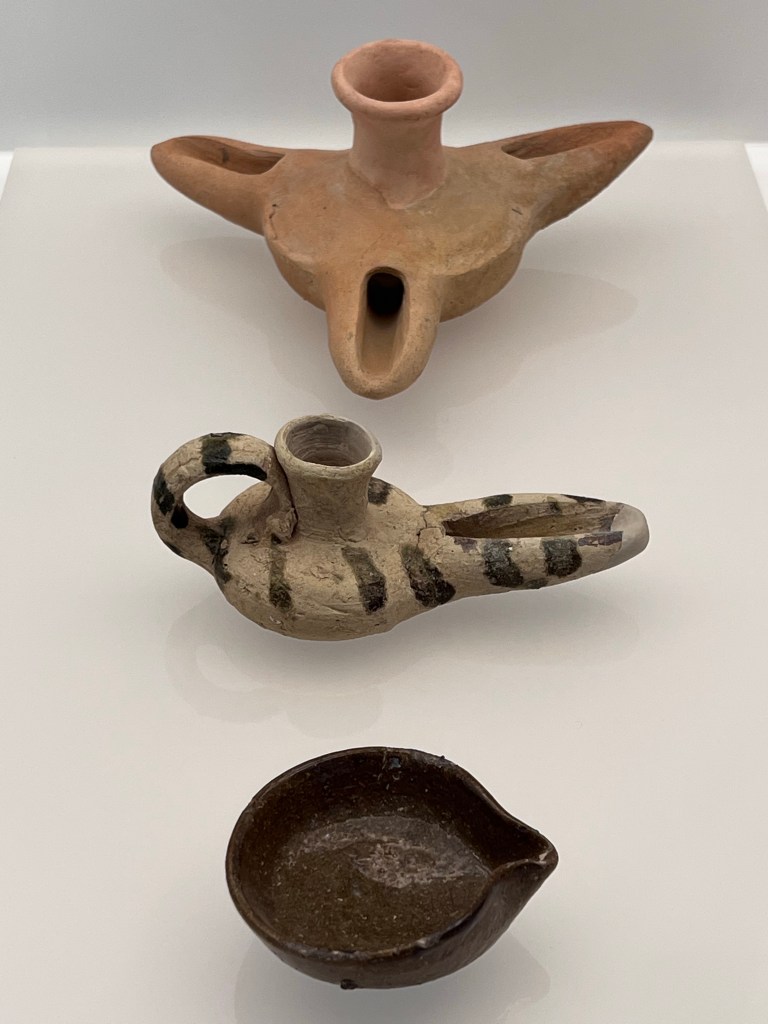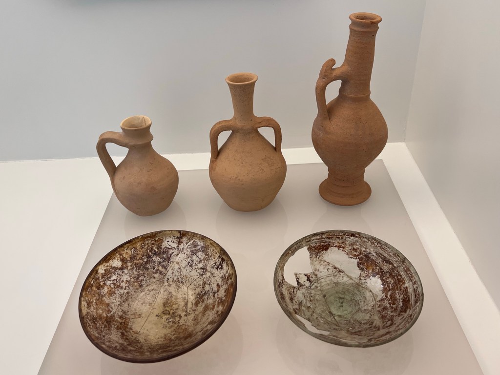The displayed items included ceramics from Phoenician and Roman times, as well as these three jugs from the 5th century – the Visigoth era. They were thrown on a wheel, which represents another innovation in human history of the time (along with iron metalworking, minting currency, and improved cultivation of olives and grapes).