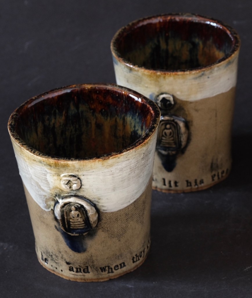 I sometimes use stamps in my ceramic pieces, most typically around the base but sometimes elsewhere on the piece. I make some stamps. I’ve acquired other stamps during travels in Asia and Latin America. I use a variety of typographic stamps in my work.